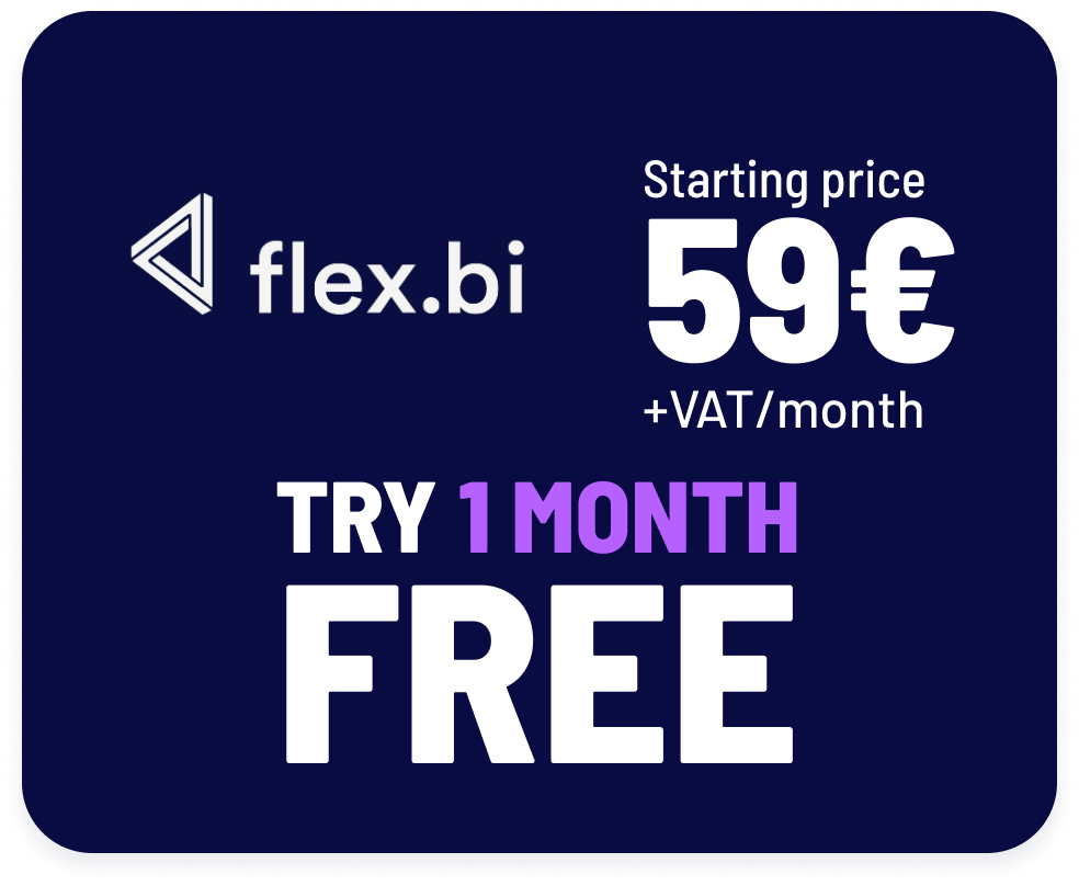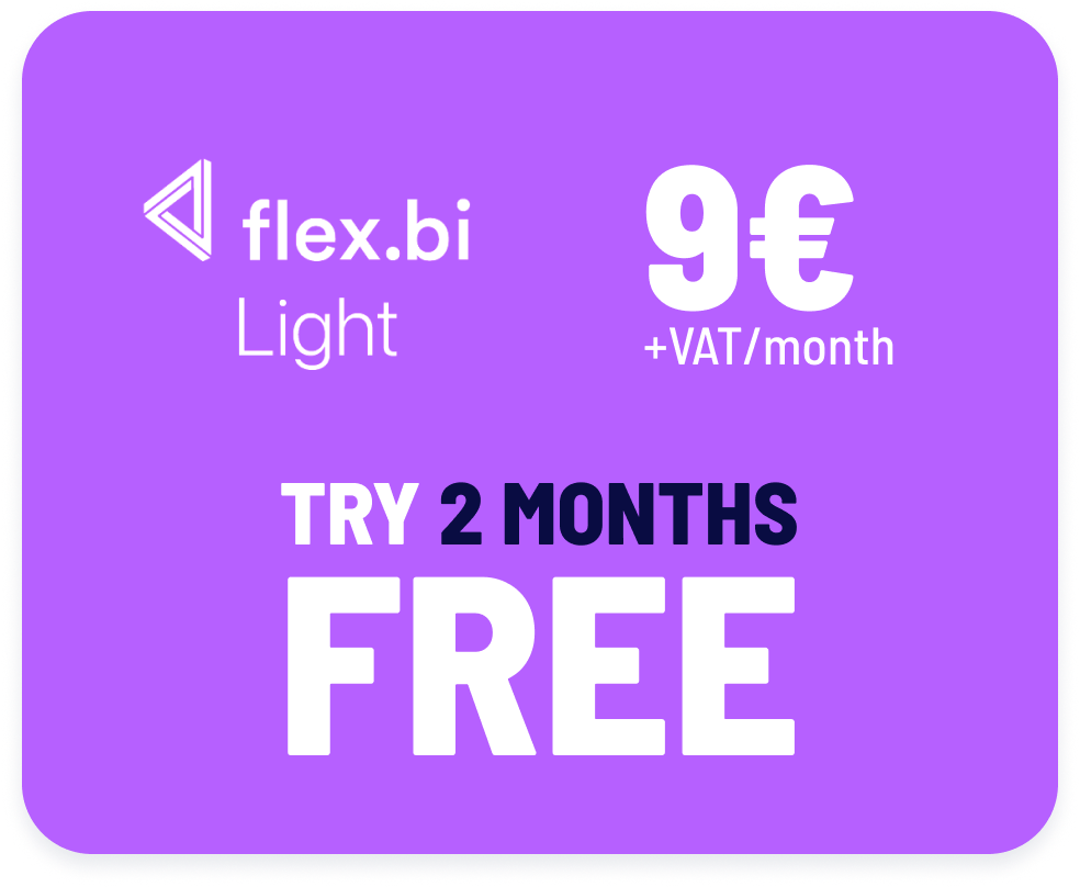 With the Flex.bi Basic Package, you gain the ability to analyze your company’s entire financial data. Pricing starts at €59 + VAT per company per month. For more information, please contact us at info@excellent.fi.